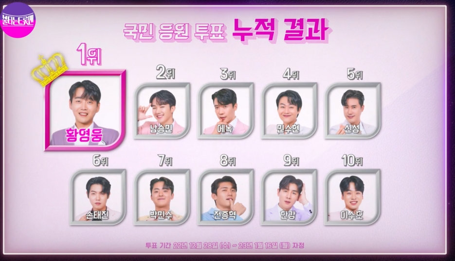 미트의 시청률 73%를 이길 수 있을까? 불타는 트롯맨에 대한 기대감이 큰 가운데 결승전 투표를 진행합니다. 생방송으로 진행되다보니 2023년도에 결과를 발표하게 됩니다. 현재까지 불타는 트롯맨 국민응원 누적투표 순위를 보면 황영웅이 우승할 가능성이 매우 높은 상황 입니다. 남승민과 에녹이 그 뒤를 바짝 추격하고 있기 때문에 불트 결승투표로 인해 대반전이 일어날지 기대 됩니다.
